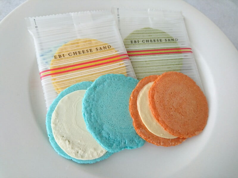 薄焼きのえびせんべいでチーズソースをサンドしたお菓子です。