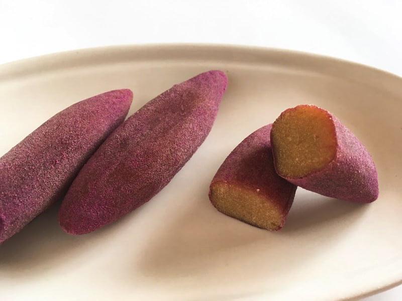 紫いもの粉を表面にまぶしてあるため、見た目はさつまいもそのもの!