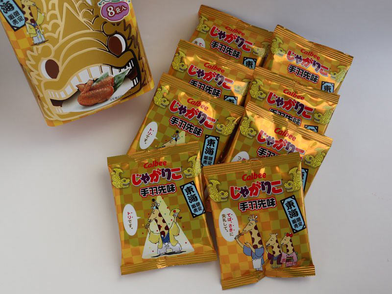 名古屋のご当地グルメ「手羽先」味のじゃがりこ。名古屋土産らしい豪華なパッケージに入っています。