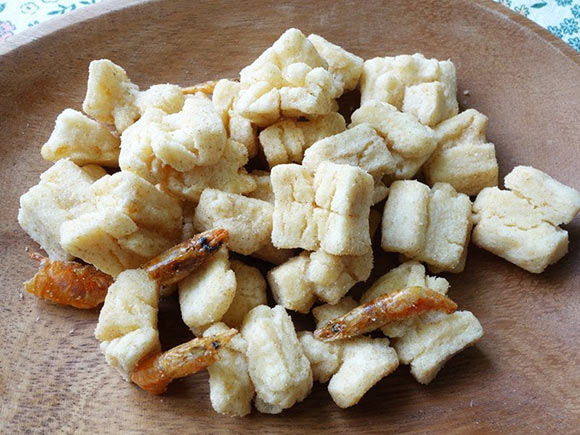小さめな一口サイズの揚げ餅がゴロゴロ入っていますよ。そして、小さな海老が所々に入っています。