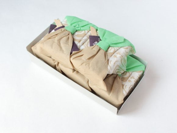今回の5つ入りは小さな風呂敷包みがさらに大きな風呂敷包みで包まれたタイプ。