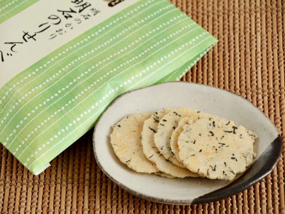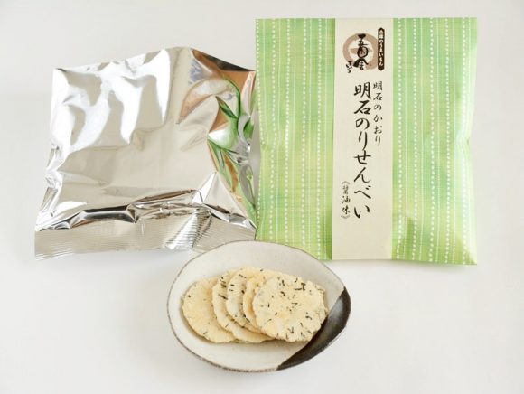 写真は明石産海苔と醬油の風味がきいたパリッと感のあるせんべい。明石の香りを楽しめるお土産です。