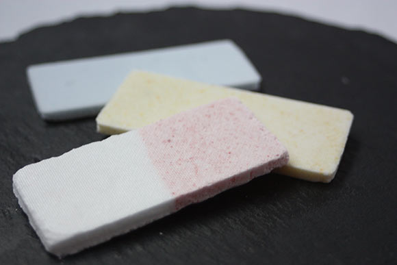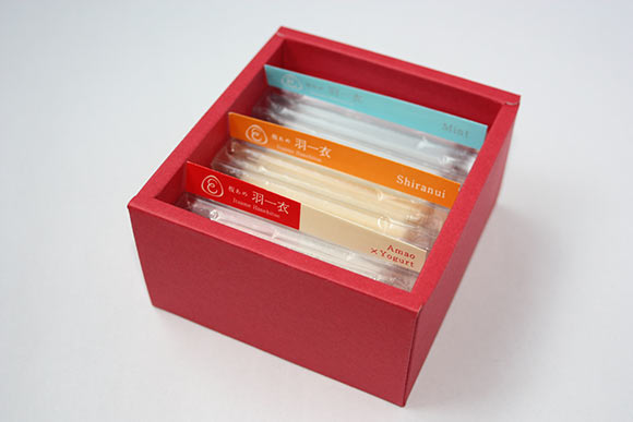 赤の専用のボックスには、あまおう×ヨーグルト、不知火(デコポンの正式な品種名)、ミントの3種類のフレーバーがそれぞれ5枚ずつ入っています。