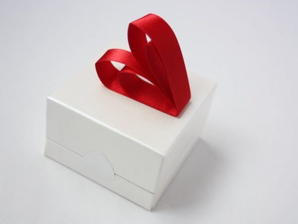 白いリングケースのようなボックスの中には、可愛らしいハート形のキャンディーが一粒入っています。