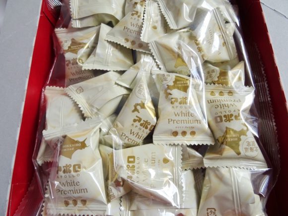 豪華な雰囲気がある箱を開けると、一つ一つ白いパッケージに包装されているアポロが箱にびっしり詰まっています。北海道限定の文字がうれしいですね。