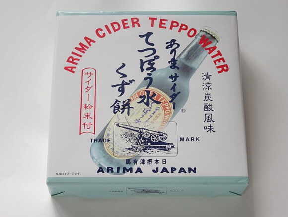 「ありまサイダーてっぽう水くず餅」は「有馬サイダーてっぽう水」をイメージした、清涼炭酸風味のくず餅。