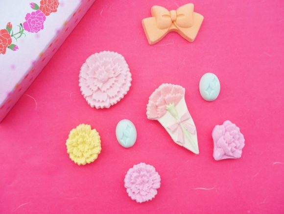 箱の中には、カーネーションや花束、手紙など、母の日にちなんだ干菓子が入っています。
