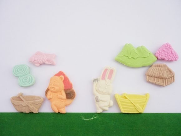かちかち山でおなじみのうさぎやたぬき、泥の舟や木の舟がかたどられていますよ。