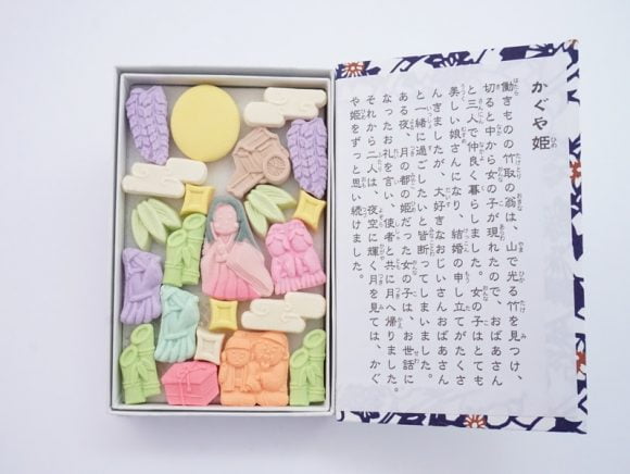 かぐや姫やおじいさん、おばあさん、月や竹といった物語に出てくるモチーフがかたどられています。