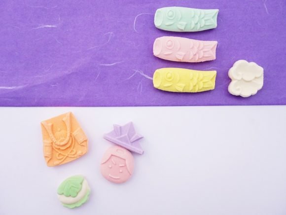 箱の中には、こいのぼりやかしわもち、兜など、こどもの日にちなんだ干菓子が入っています。