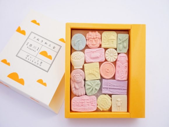 箱の中には、香川にちなんだモチーフの干菓子が入っていますよ。
