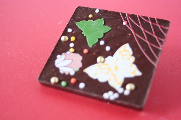 赤や緑、白の金平糖や蝶々の形をしたチョコレートなどがトッピングされていて、見た目も華やかな板チョコレートです。