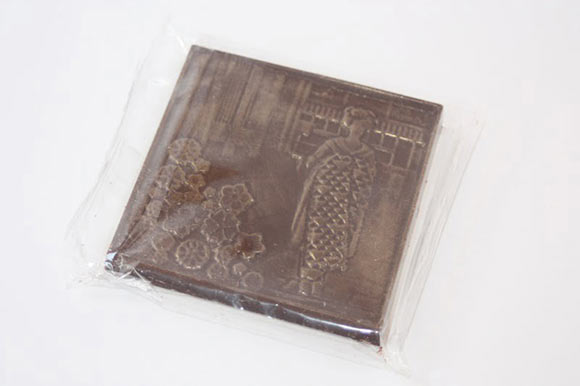 光沢があるチョコレートの表面には、舞妓さんの姿が描かれています。