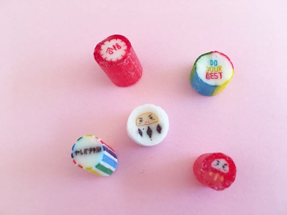 「ヤレバデキル」と描かれたキャンディーは、側面がレインボーカラーのストライプ柄になっています。