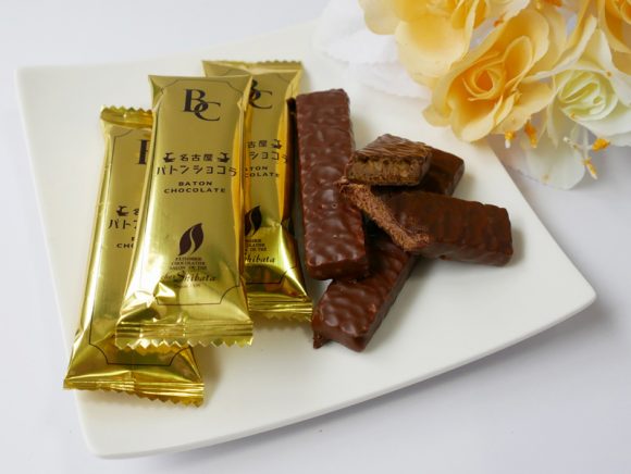 名古屋バトンショコラは、ココアクリームを挟んだウエハースが、ミルクチョコレートでコーティングされているお菓子。
