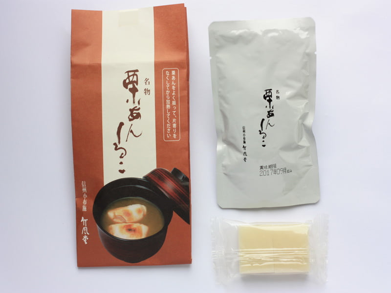 開封してみると、中にはレトルトパウチに入った栗あんしること、お餅が2つ入っています。