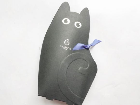 猫の形をした可愛い外装の中には、銀色の包みに入ったアーモンド入りのチョコレートが詰まっています。