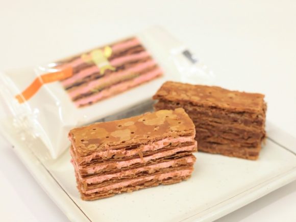 チョコレートを練りこんだ5層のパイ生地に、チョコとストロベリーのクリームがそれぞれ挟まれていますよ。