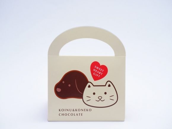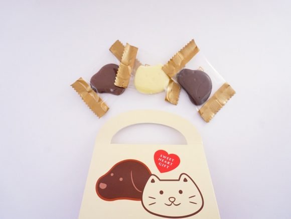 小犬のかたちをしたスイートチョコ・ミルクチョコレート、小ねこのかたちをしたホワイトチョコレートの3種がセットになっていますよ。