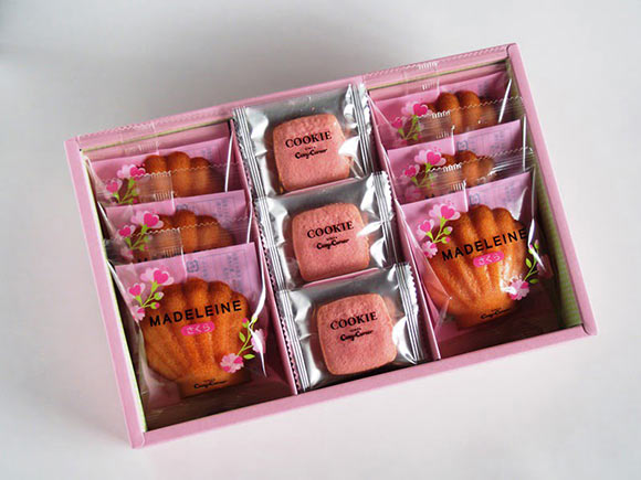 ふわっとさくらが香るマドレーヌと、かわいいいちごクッキーが入っています。