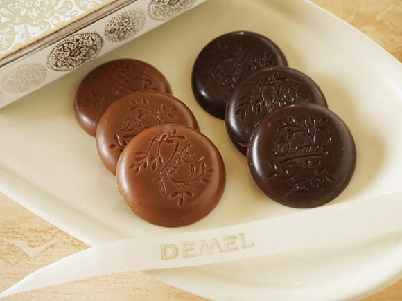 2色のチョコレートの表面には、「デメル」の文字と植物モチーフが。