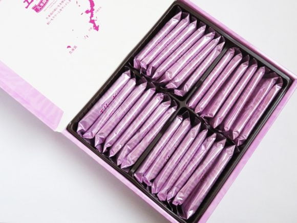 歯切れのよいウエハースの中には、薄い紫色のクリームが入っています。