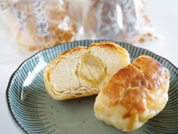 しっとりとしたパイ生地のなかには黄身あん入りで、さらに中心部には栗がひとつぶ。