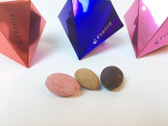 ピンク色にティラミスアーモンド、青色に珈琲アーモンド、赤色に苺アーモンドが5個ずつ入っています。