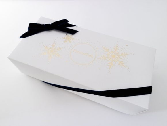 雪の結晶をあしらった白い箱には、ベロア生地のリボンがかかっています。