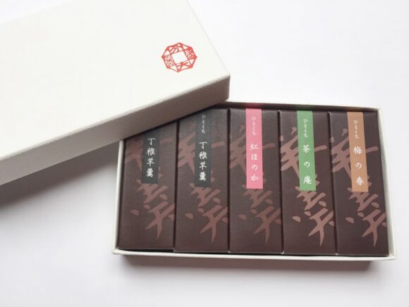 今回購入した5個入りのひとくち羊羹には、丁稚羊羹2個、梅の春1個、紅ほのか1個、茶の庵が1個入っています。