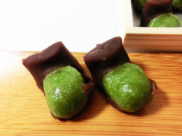 お餅を餡でくるんだお菓子は多くありますが、こちらの餡は珍しい形ですよね。