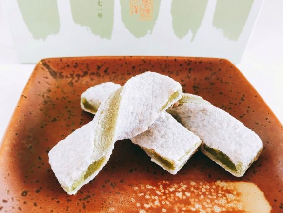 白ごま入りの求肥と手亡あんをあわせ、ひねりを加えた短冊型のお菓子。