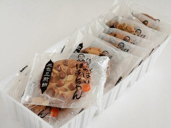 今回紹介する佐賀のがばいばあちゃんは、黒豆、青大豆、落花生の3種類が入ったせんべい。豆とクッキーのような生地の組み合わせです。
