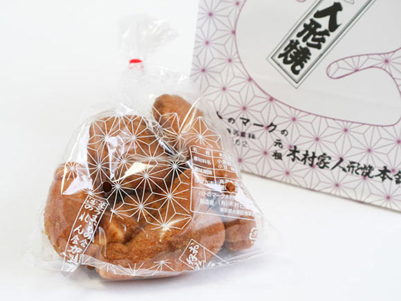 ハトのマークが描かれた紙袋を開けると、ビニール袋に入った人形焼が。