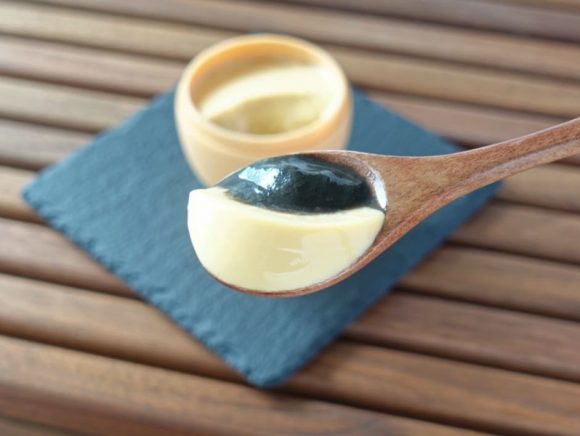 また通常のプリンは底にカラメルソースが隠れていますが、ごまたまごプリンには黒ごまのペーストが隠れています。