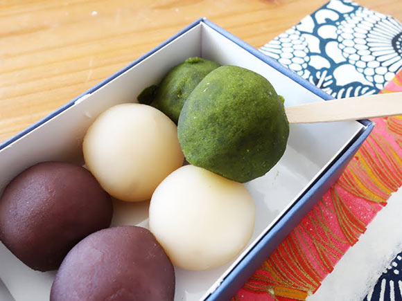 やわらかい白玉団子を赤餡と白餡、抹茶餡で包んでいます。