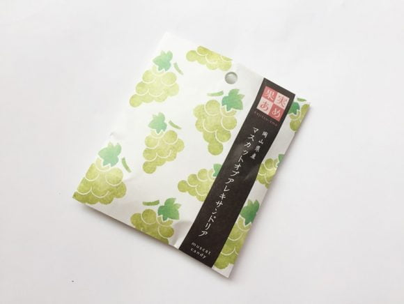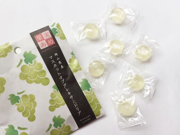 果実あめ(岡山県産マスカットオブアレキサンドリア)は、岡山県産マスカットのピューレを使用してつくられたあめ。