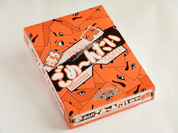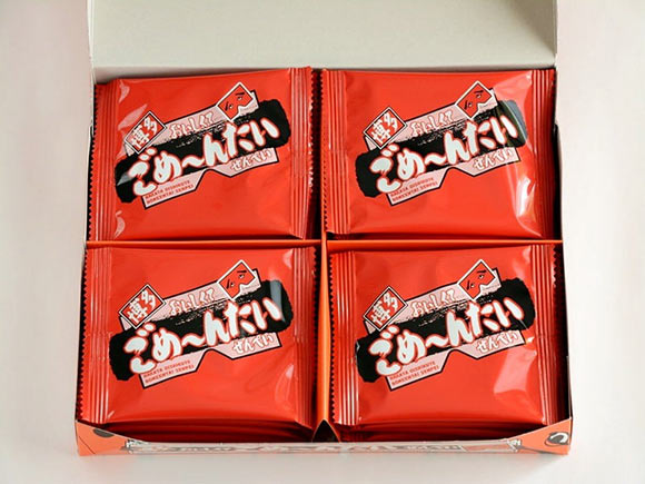 おいしくてごめ~んたいせんぺいのパッケージと個包装には、にわか面がデザインされています。