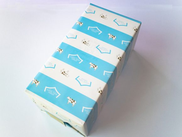 白と青のストライプに牛をあしらった可愛らしい包装紙です。箱を開ける前から気分が高まりますよ。
