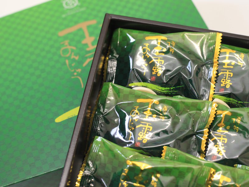 玉露の生葉をペースト状にしたものを、生地ではなく餡に練りこんであるのが玉露まんじゅうの特徴。