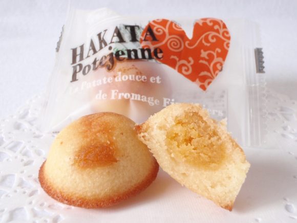 博多ポテジェンヌは、パルメジャンチーズの生削りをつかった香ばしいチーズフィナンシェで安納芋の餡をやさしく包みこんだお菓子です。