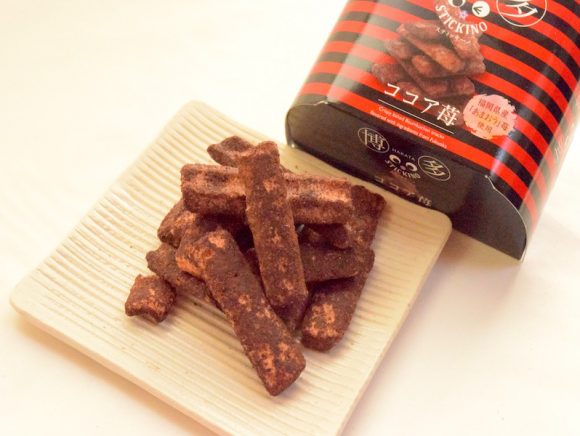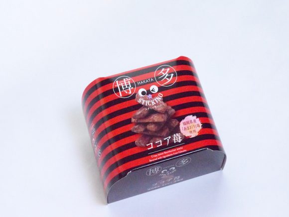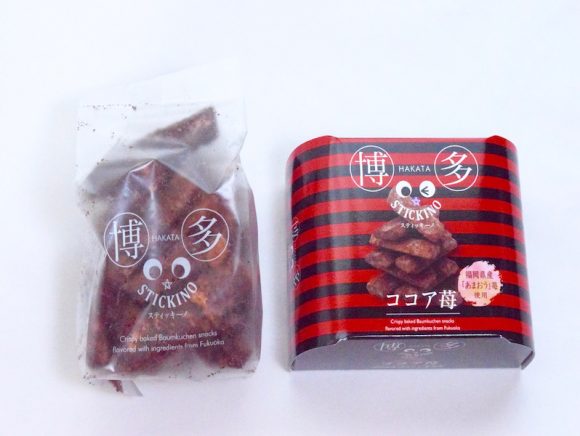 「博多スティッキーノ ココア味」は、福岡名産の”あまおう”とココアの風味を兼ね備えたバウムクーヘンをラスクにしたものです。