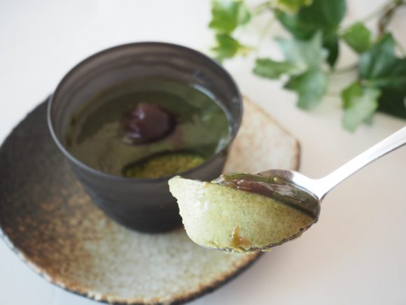 宮崎県産の釜炒り茶と蜂蜜を使用しており、ババロアの上に濃厚なソースがかかっていて、あんこが添えられていますよ。