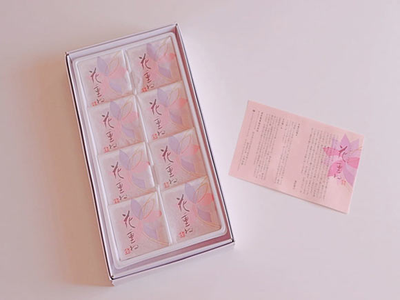 羽二重餅の生地は淡いピンクと白のグラデーションで、名前通りに花が重なっているように見えました。
