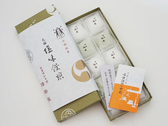 寒梅粉を使った皮に、赤穂塩を加えたこしあんを包んだ「塩味(しおみ)饅頭」は、赤穂市のおみやげの定番品。