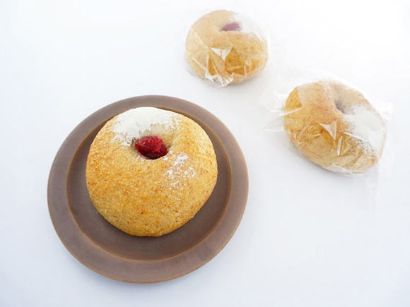上にちょこんっとトッピングされた、いちごが愛らしい一品。見た目はベーグルというより、まるでスイーツのようです。