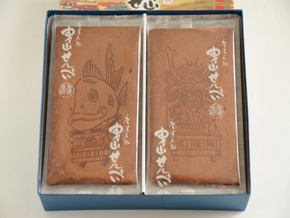 唐津市のお祭りとして有名な、「唐津くんち」で使用される14台の曳山を焼印したせんべい。