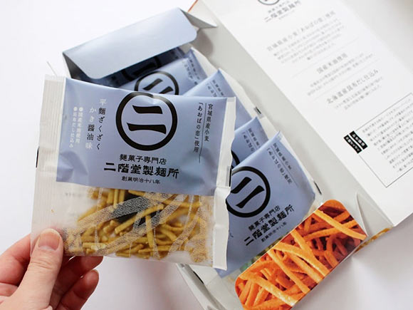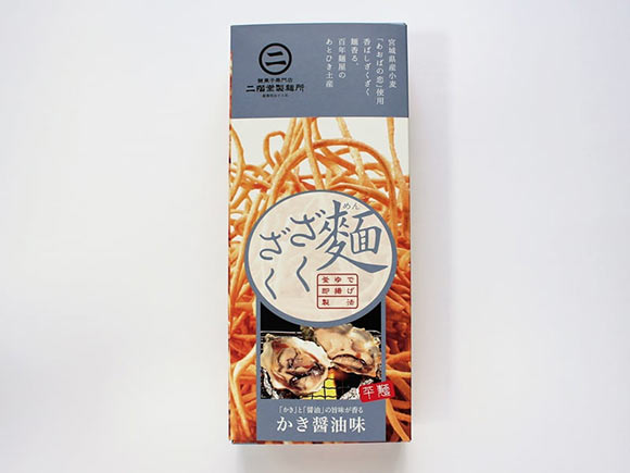 平麺ざくざくかき醤油味は、明治18年に宮城県登米地方で創業した「二階堂製麺所」がつくる麺菓子。