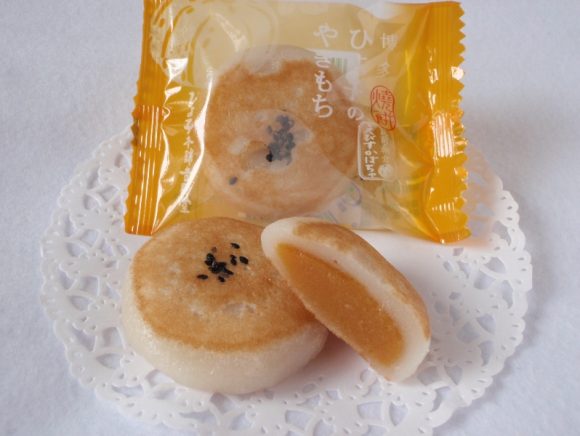 香ばしい国産黒ごまを乗せたお餅に、ひよ子さんオリジナルのかぼちゃ餡をたっぷり詰め込み焼き上げた「ひよ子のやきもち かぼちゃ」