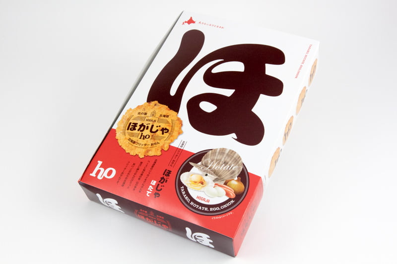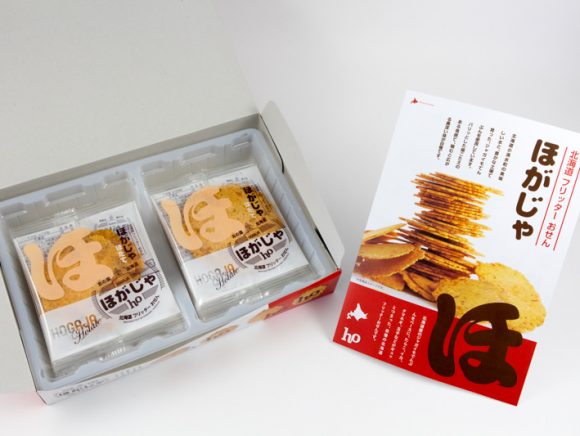 ほがじゃは、北海道小清水町産のじゃがいもでんぷんをベースに、オホーツクで獲れたホタテやいか、北見産のたまねぎを練り込み、薄くパリッと揚げたおせんべいです。